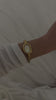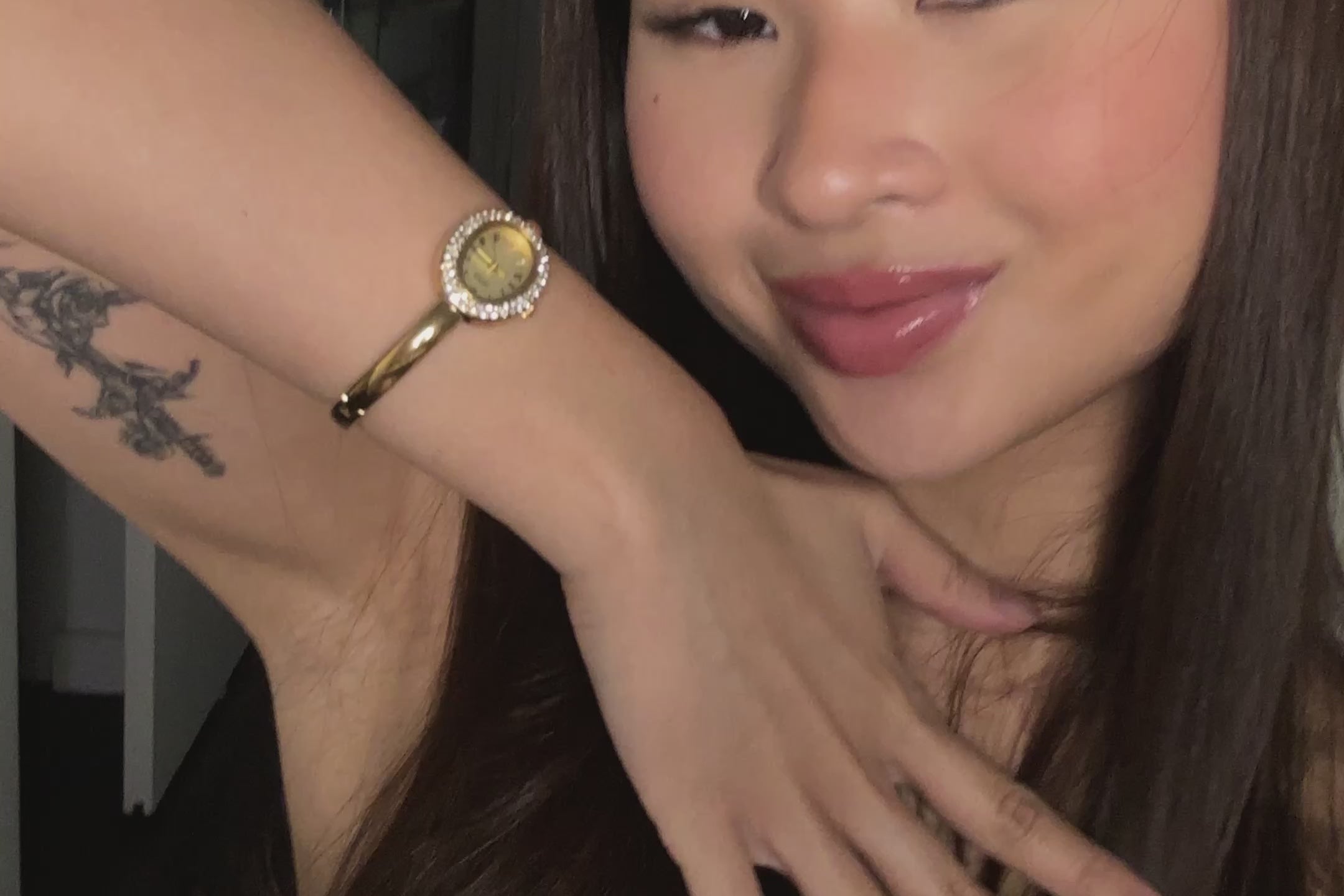 Woman wearing gold jewelry including a watch and ring, with a red background.